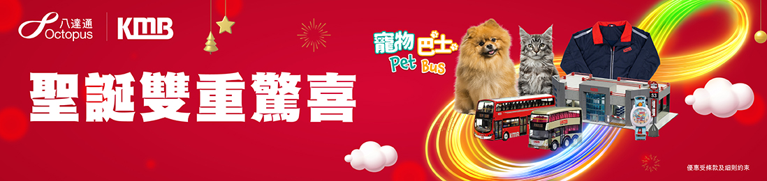 今個冬天,八達通聯同九巴為你送上雙重驚喜! 由2025年12月8日至2026年1月31日,用八達通於九巴網店消費或九巴 APP1933購買寵物巴士車票,可享優惠!立即行動,趁佳節買禮物送給摯愛或與寵物游巴士河!